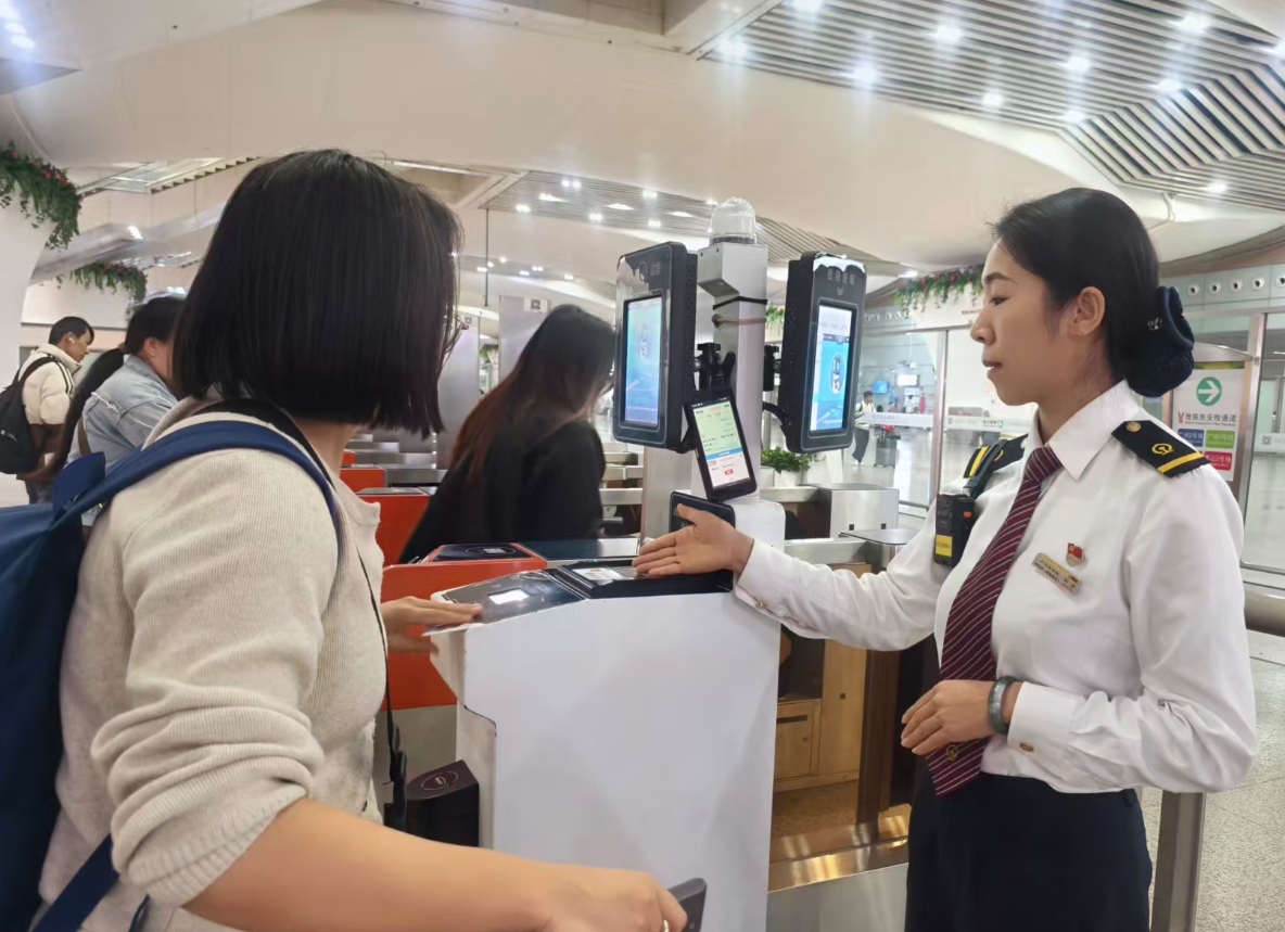 “鞠崇,速到服务台!”对讲机里传来同事的呼叫,刚整理好客运记录的她立刻快步赶去。服务台前,一位白发老人脸色苍白、浑身无力地倚着立柱。她当即蹲下身,轻轻扶住老人的胳膊柔声安抚:“大爷您别慌,我是车站工作人员,您哪里不舒服?”得知老人因未进食引发头晕,鞠崇立刻取来温水和糖果,扶老人到座椅上休息,待老人状态平稳后,又全程护送他顺利换乘地铁,暖心周到的服务,让老人连连竖起大拇指称赞。
